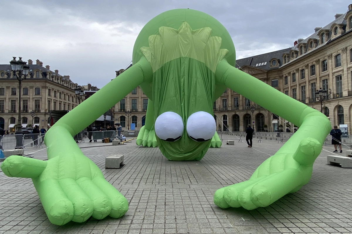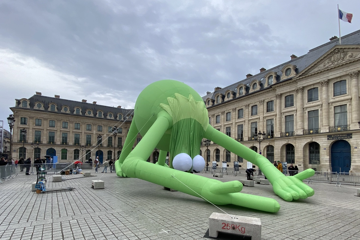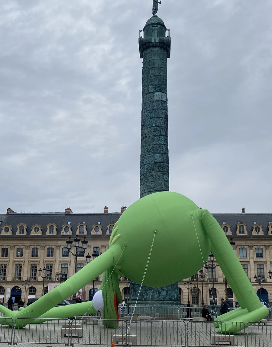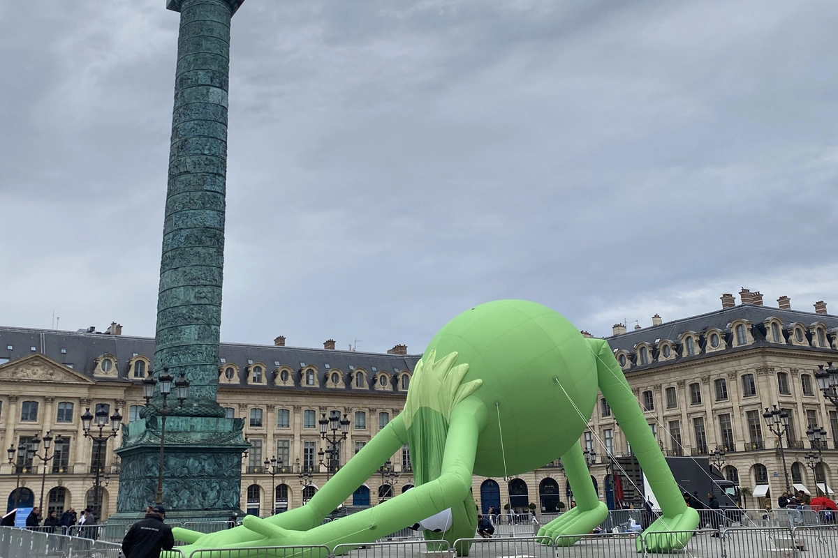 A gigantic helium-filled Kermit the Frog, created by Alex Da Corte, hovers over Place Vendôme during Art Basel Paris. The historic square is transformed into an unlikely stage where pop humour and a quiet melancholy come together beneath the nearly 20-metre inflatable figure.