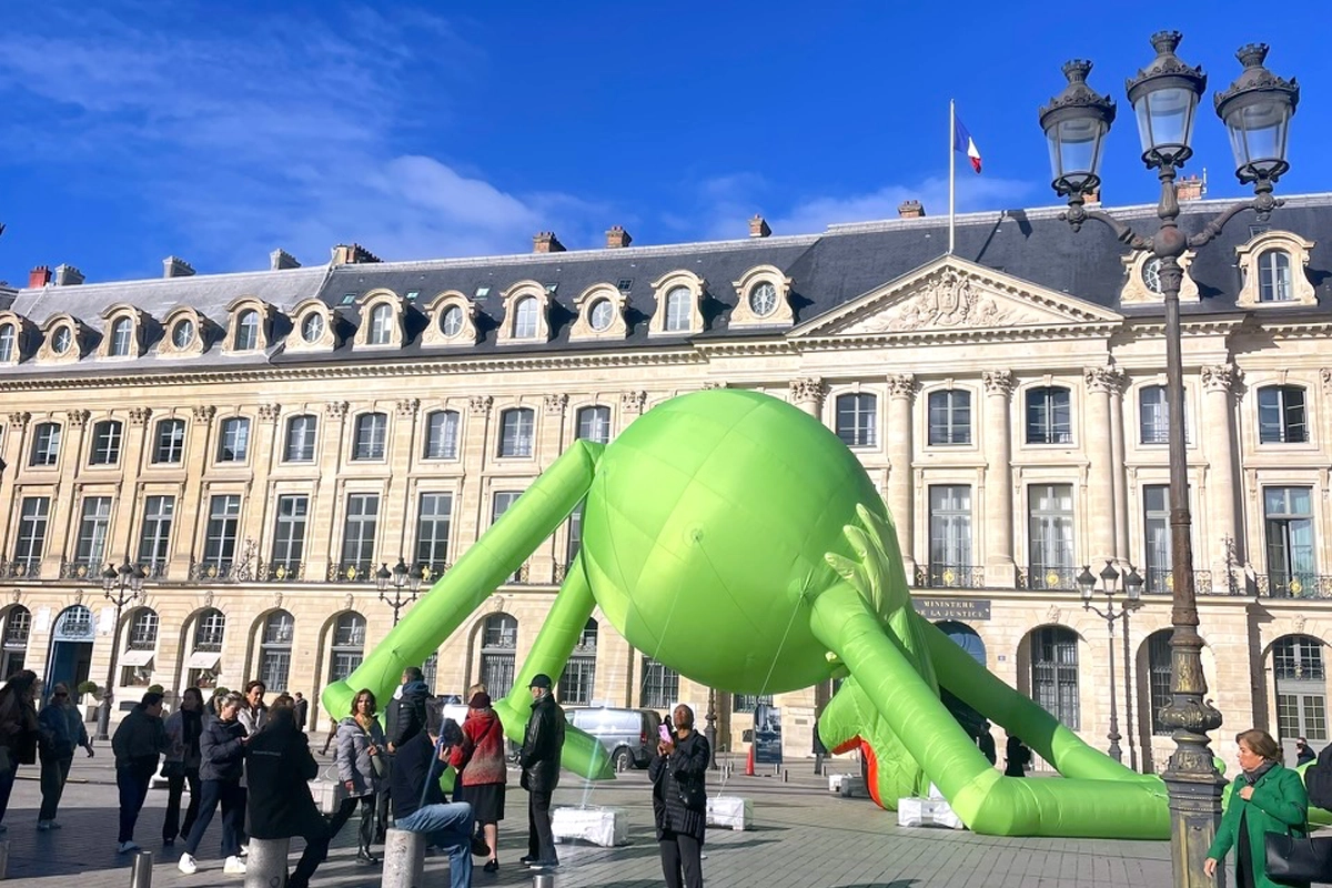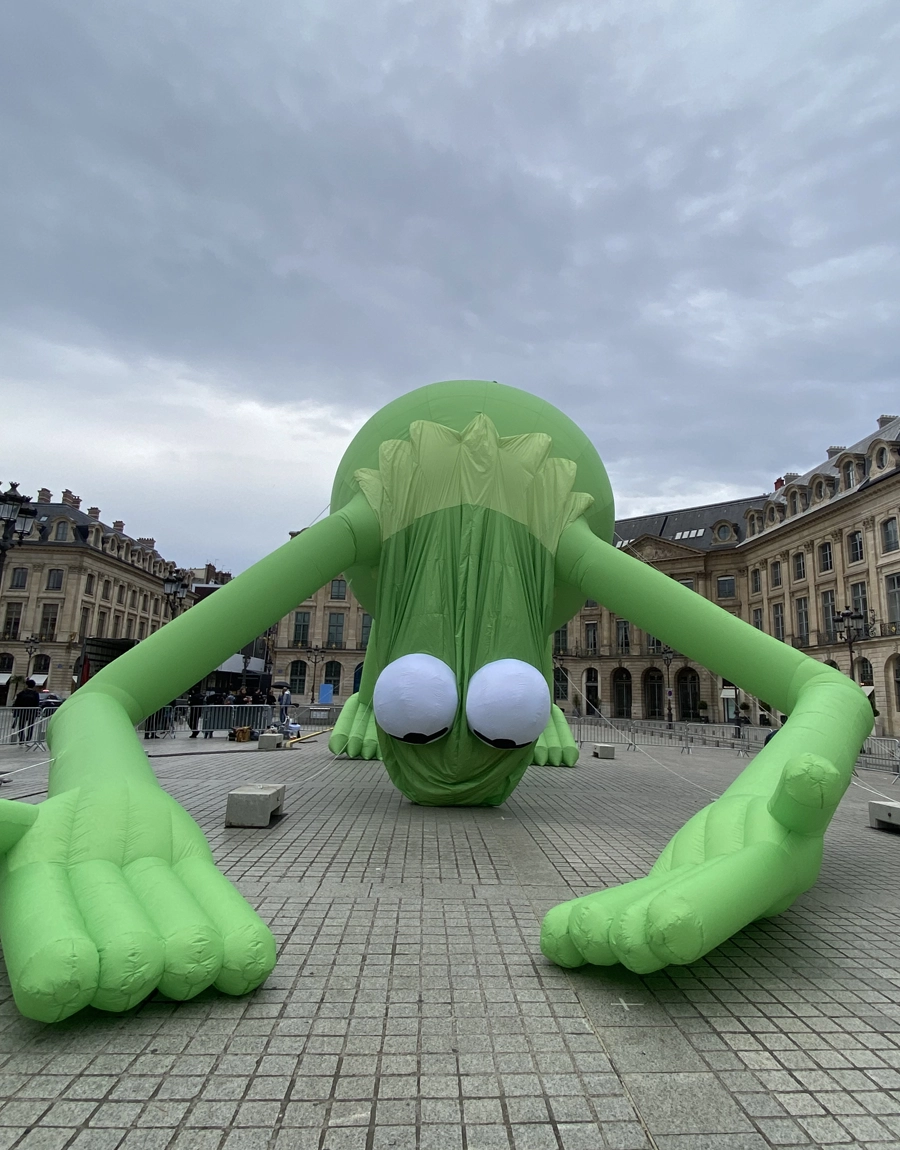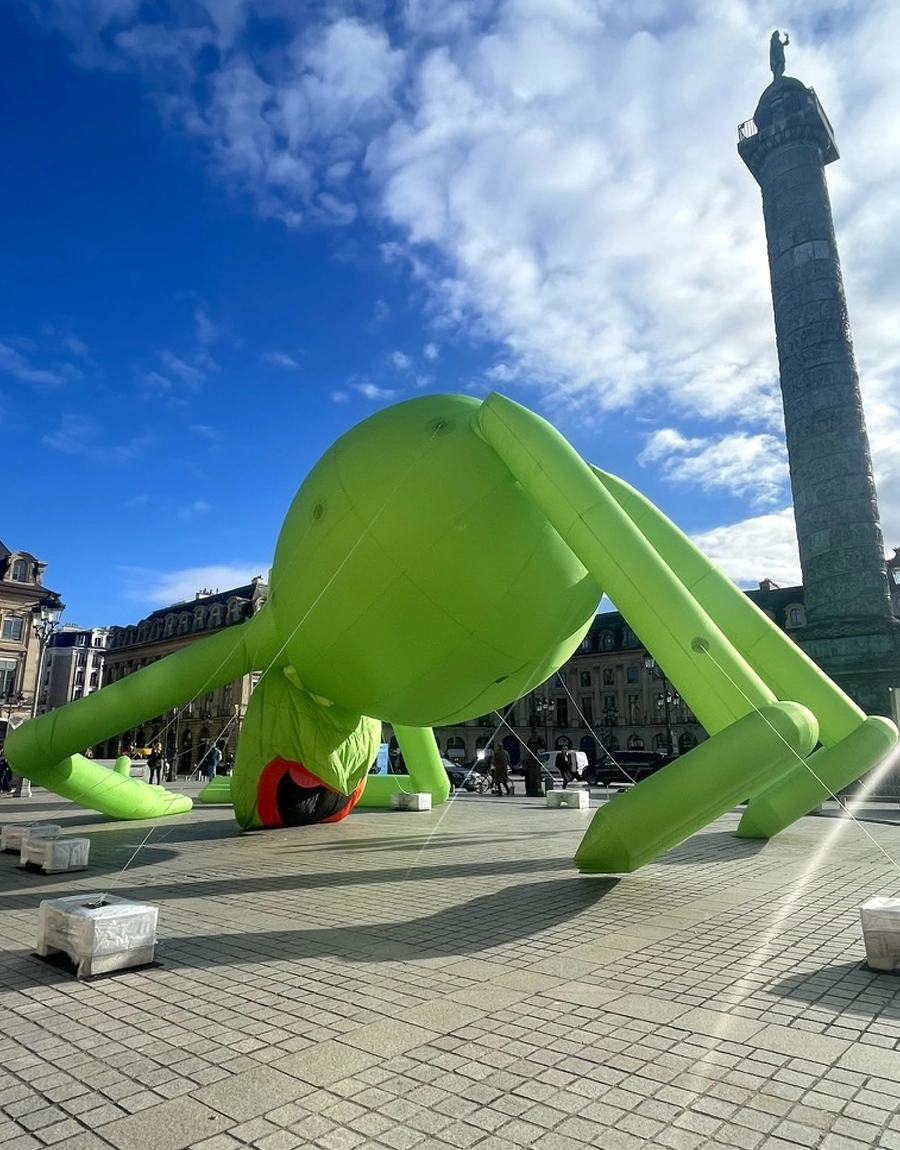 A gigantic helium-filled Kermit the Frog, created by Alex Da Corte, hovers over Place Vendôme during Art Basel Paris. The historic square is transformed into an unlikely stage where pop humour and a quiet melancholy come together beneath the nearly 20-metre inflatable figure.